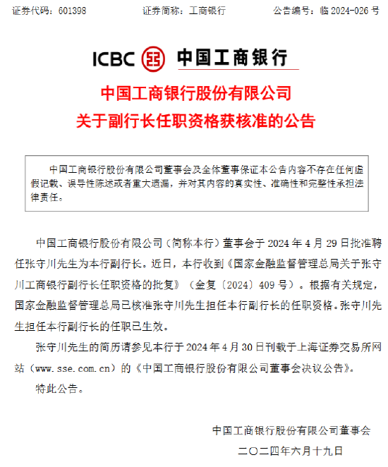 6月19日金融一线音信,工商银行当天发布对于副行长任职经验获核准的公告。公告透露,该行董事会于 2024 年 4 月 29 日批准聘用张守川为副行长。近日,该行收到《国度金融监督管束总局对于张守川工商银行副行长任职经验的批复》(金复〔2024〕409 号)。阐述关联规则, 国度金融监督管束总局已核准张守川担任该行副行长的任职经验。