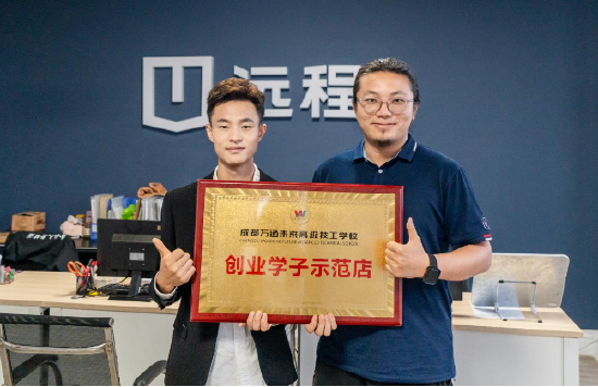 袁涛(左一)手脚万通汽车教师优秀创业学子领受院校授牌