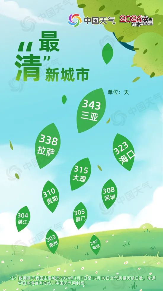 无独特偶,2024年最“湿”润城市与最“清”新城市的榜都门是三亚。三亚、北海、湛江、海口等沿海城市,受海上暖潮湿流影响,空气相对湿度较高,空气质料也相对较好。