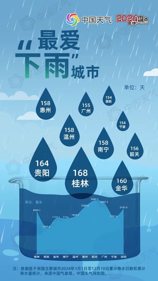 华南地区向来是降水最充沛、台风最喜爱的区域。2024年最爱下雨城市排名榜上,华南地区包揽六席,其中,桂林以168天降水日数摘得桂冠,南宁、惠州、韶关、广州、深圳也榜上著明,这些城市的累计降水量也多在2000毫米以上,都是雨神格外偏疼之地。