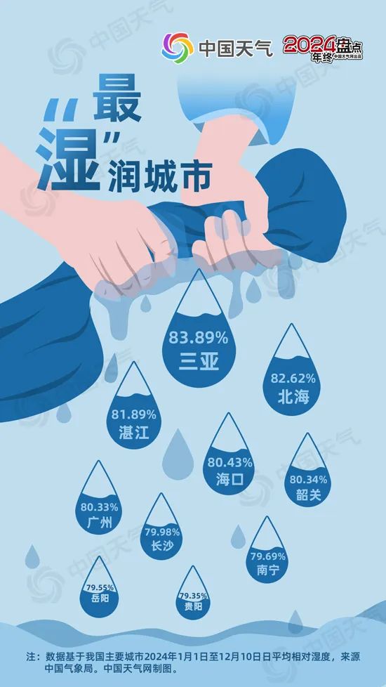 投入最“湿”润城市排名榜的还有长沙、岳阳、贵阳等地,这些地区虽不临海,但雨水充沛,邻近河流、湖泊广宽,水体挥发的水汽也会增多空气湿度,使通盘城市更为湿润。