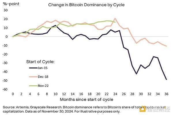 图 7:比特币主导地位于前两轮周期第三年运转着落