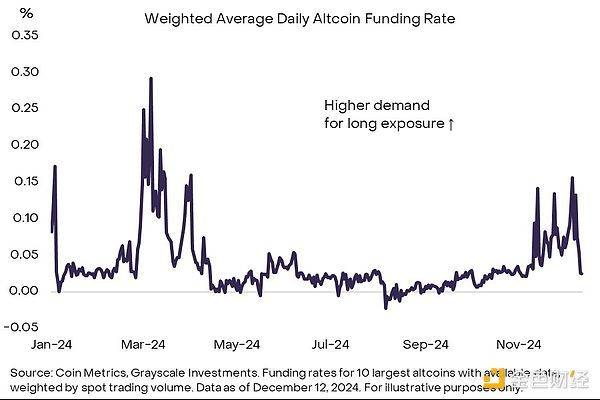 举例,投资者可监测资金费率,即永续期货合约多头握仓握有成本。投契往复者杠杆需求高时,资金费率攀升。故阛阓资金费率水平可臆测合座投契性多头程度。图 8 展示比特币外十大加密金钱(最大“盗窟币”)加权平均资金费率。面前费率显贵为正,标明杠杆投资者多头需求繁荣,尽管上周阛阓暴跌时骤降。即便局部高点,也低于本岁首及上轮峰值。由此不雅之,面前水平契合阛阓中度投契性多头,距阛阓周期相配尚远。