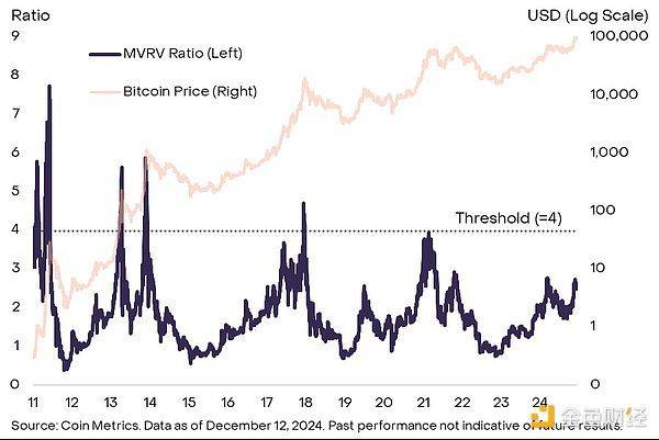 其中备受爱重的主义是比特币市值(MV,以二级阛阓价钱计每枚币)与竣事价值(RV,以链上最近往复价钱计每枚币)之比,即 MVRV 比率,可视为比特币市值超阛阓总成本的程度。往常四轮周期,该比率至少达到4(图 4)。面前 MVRV 比率为 2.6,预示此轮周期或有后续行情。不外,各周期该比率峰值渐低,价钱登顶前偶然涉及 4。 图 4:MVRV 比率处于中间水平